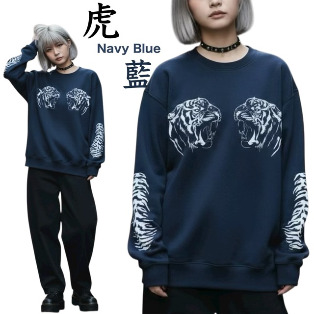 虎 タイガー トレーナー スウェット ネイビー 濃紺 紺 カラー 大きめ 大きいサイズ イラスト オリジナル プリント 個性的 サブカル ポップ 綿100% cotton100% 鮮やか ゆるコーデ かっこいい 動物 アニマル 個性派 かわいい