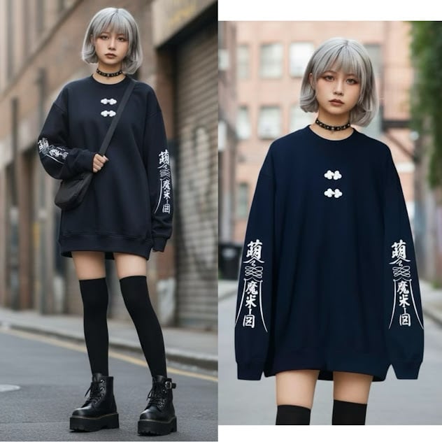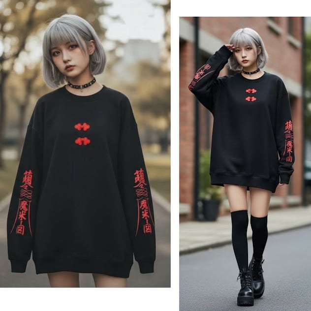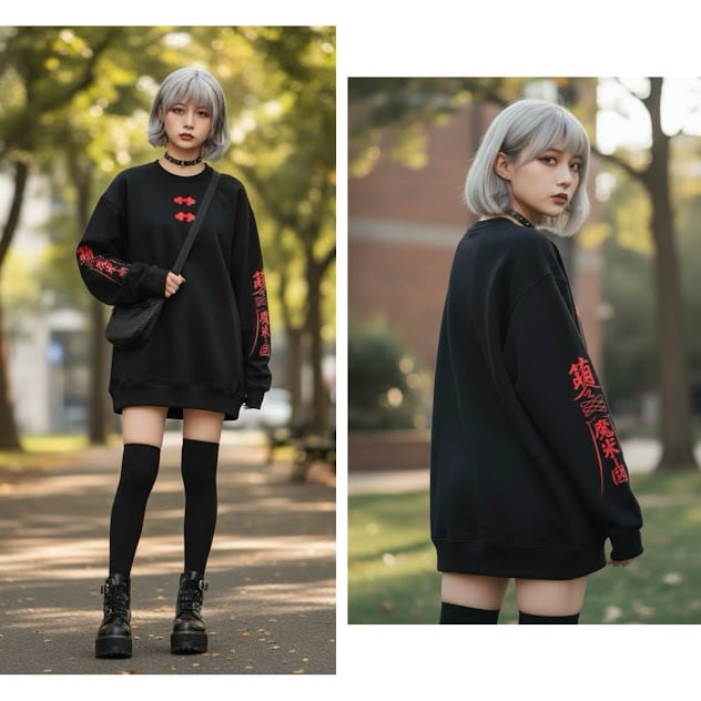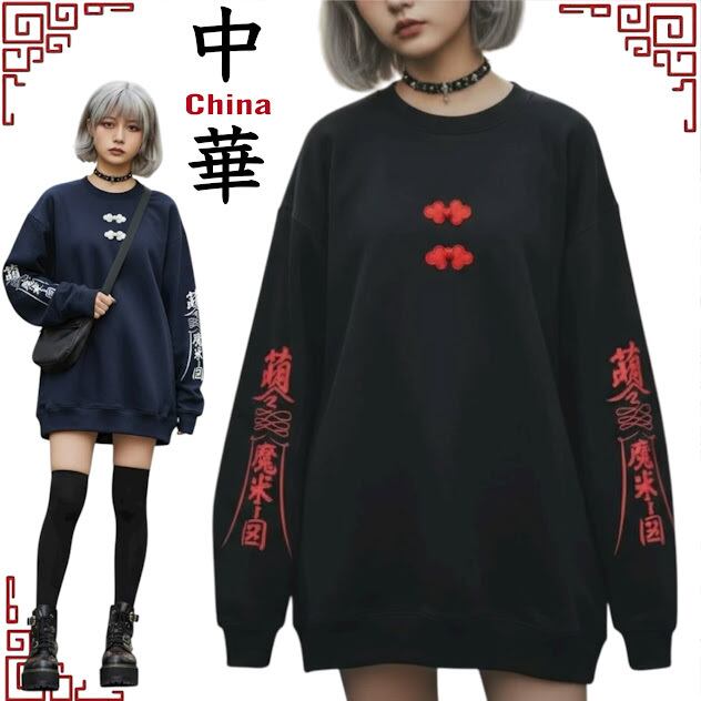 #チャイナ#中華#イラスト#袖プリント#オリジナル#サブカル#個性的#個性派#黒#ブラック#トレーナー#スウェット#お札 #かわいい #サブカル #病みかわ #綿100% #地雷 #ビッグサイズ #サブカル