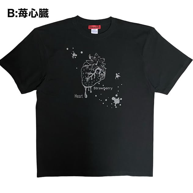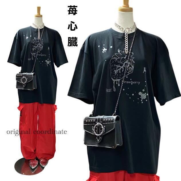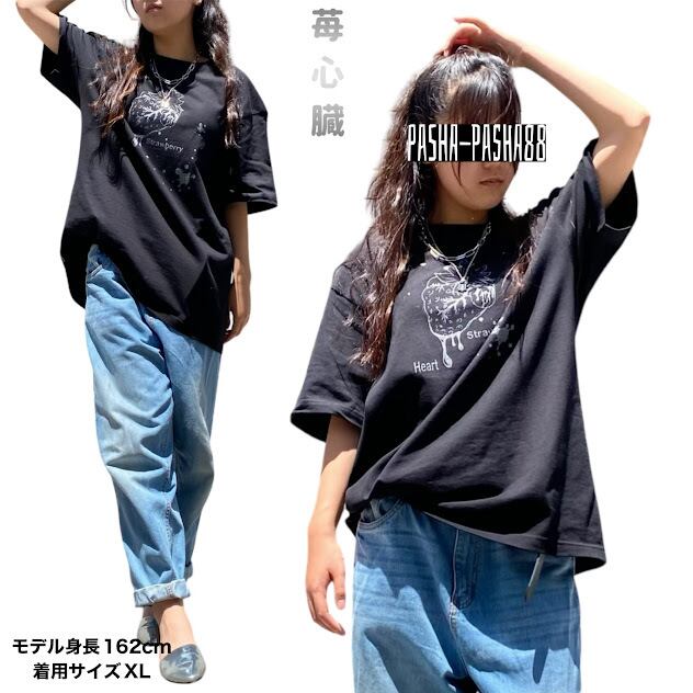Tシャツ トップス 半袖 カジュアル 普段着 イラスト 綿100% レディース 黒 ブラック 苺 心臓 ストロベリー 病みかわ 地雷 かっこいい おしゃれ サブカル 大きめサイズ オリジナル 個性的 個性派 ビッグT pasha-pasha88 パシャパシャハチハチ
