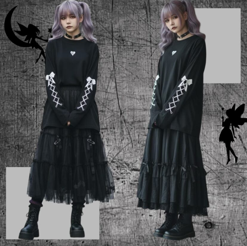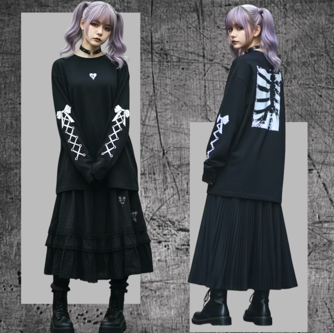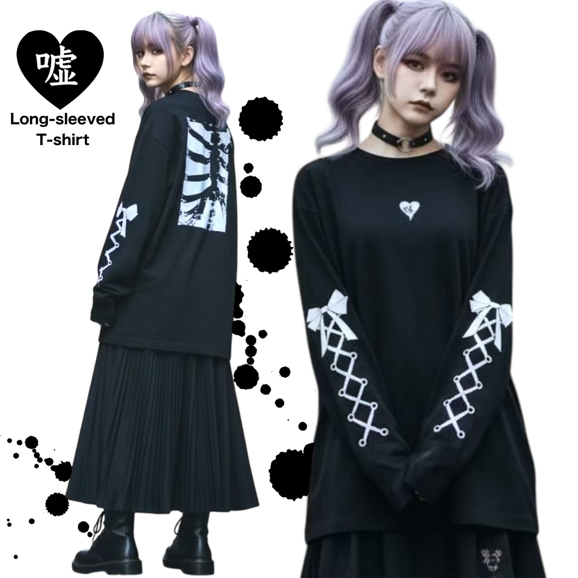 地雷 ロングTシャツ ロンT サブカル 病みかわいい 骨 ゴシック v系 ピープス系 スカル バンギャ リボン ハート ゴスロリ ゴスガール ラウド ロック 長袖 黒 ブラック 長T 韓国ファッション 原宿 ファッション パシャパシャハチハチ pasha-pasha88