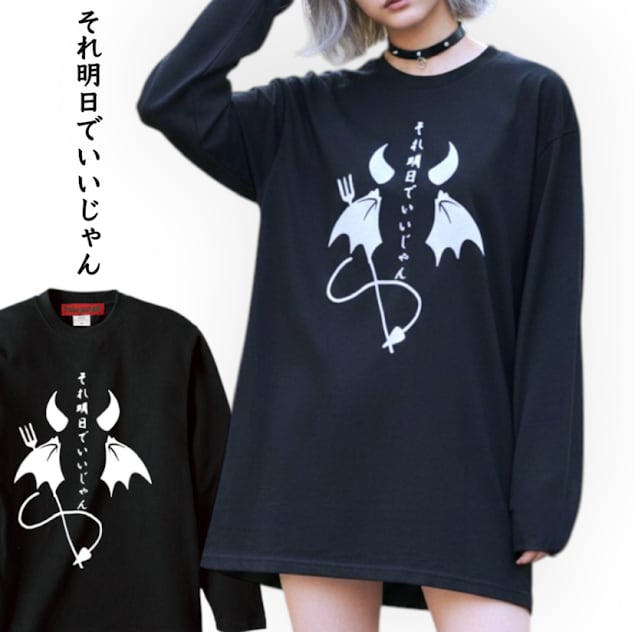 ロングTシャツ サブカル 地雷 病みかわいい サブカル地雷 クール ピープス系 個性的 黒×白 オリジナル ロンT 長T イラスト 明日でいいじゃん めんへら 原宿ファッション 韓国ファッション pasha-pasha88 パシャパシャハチハチ