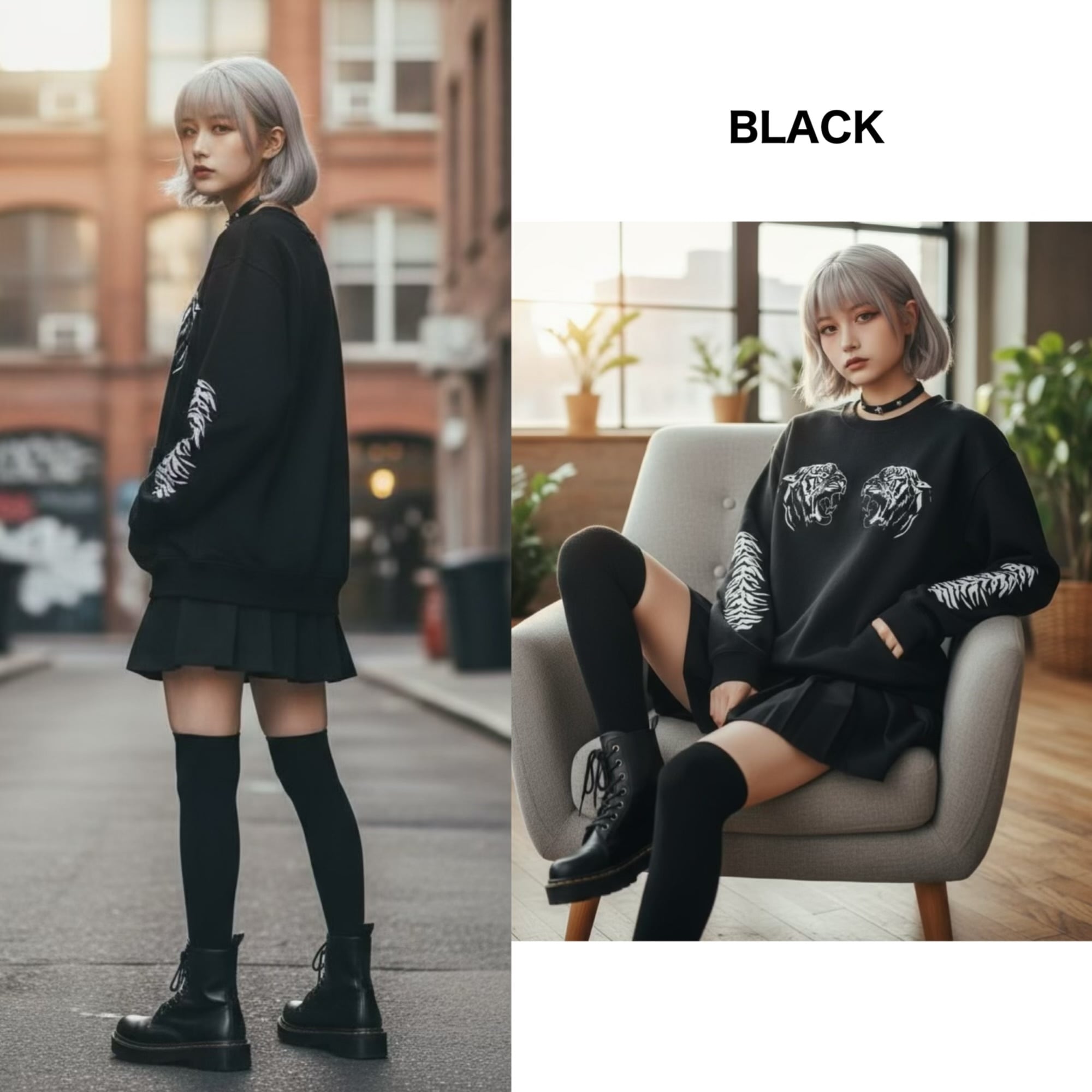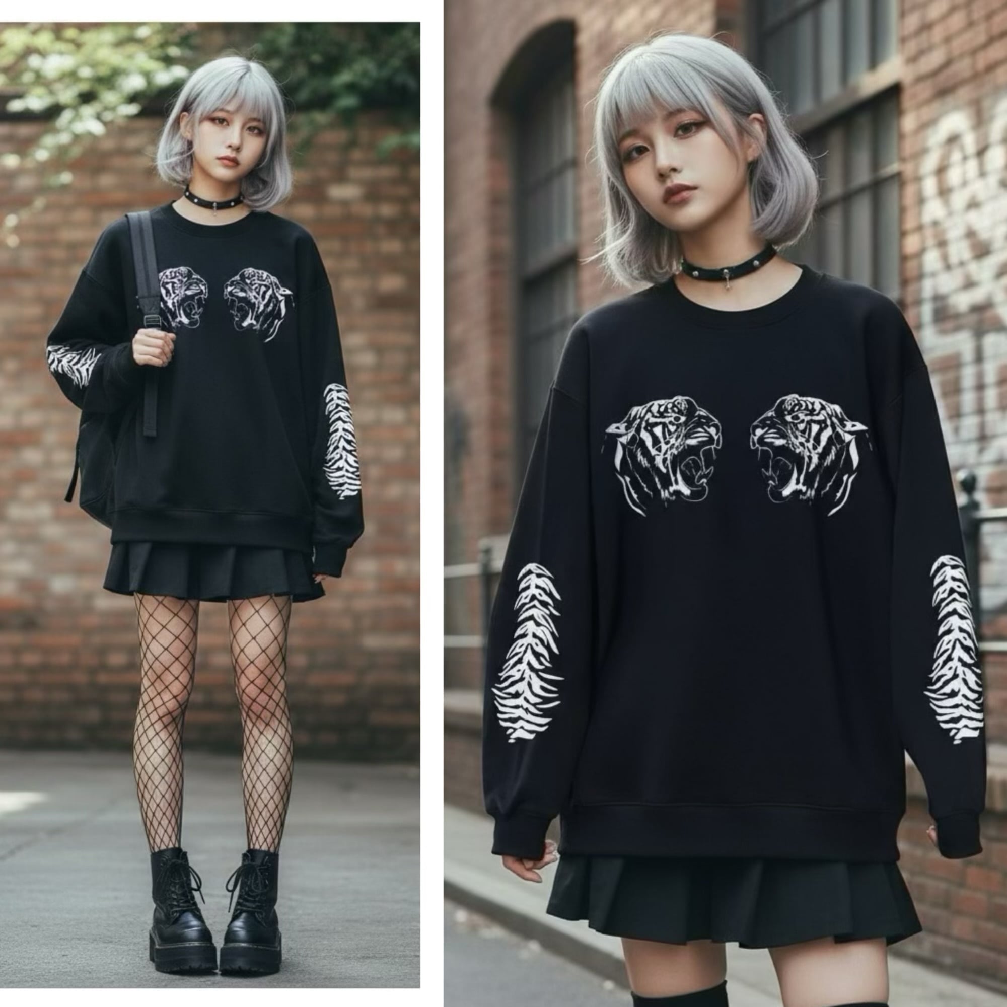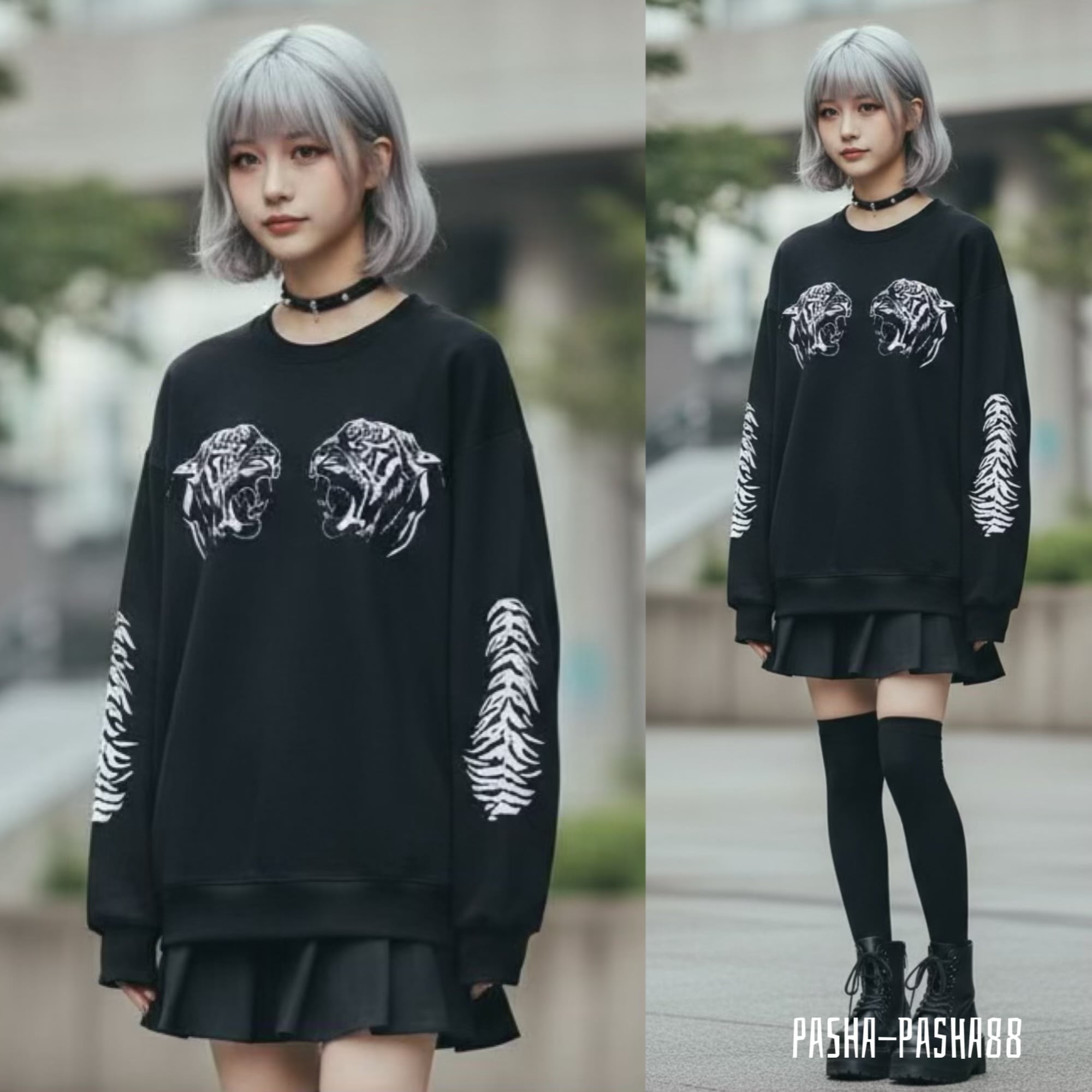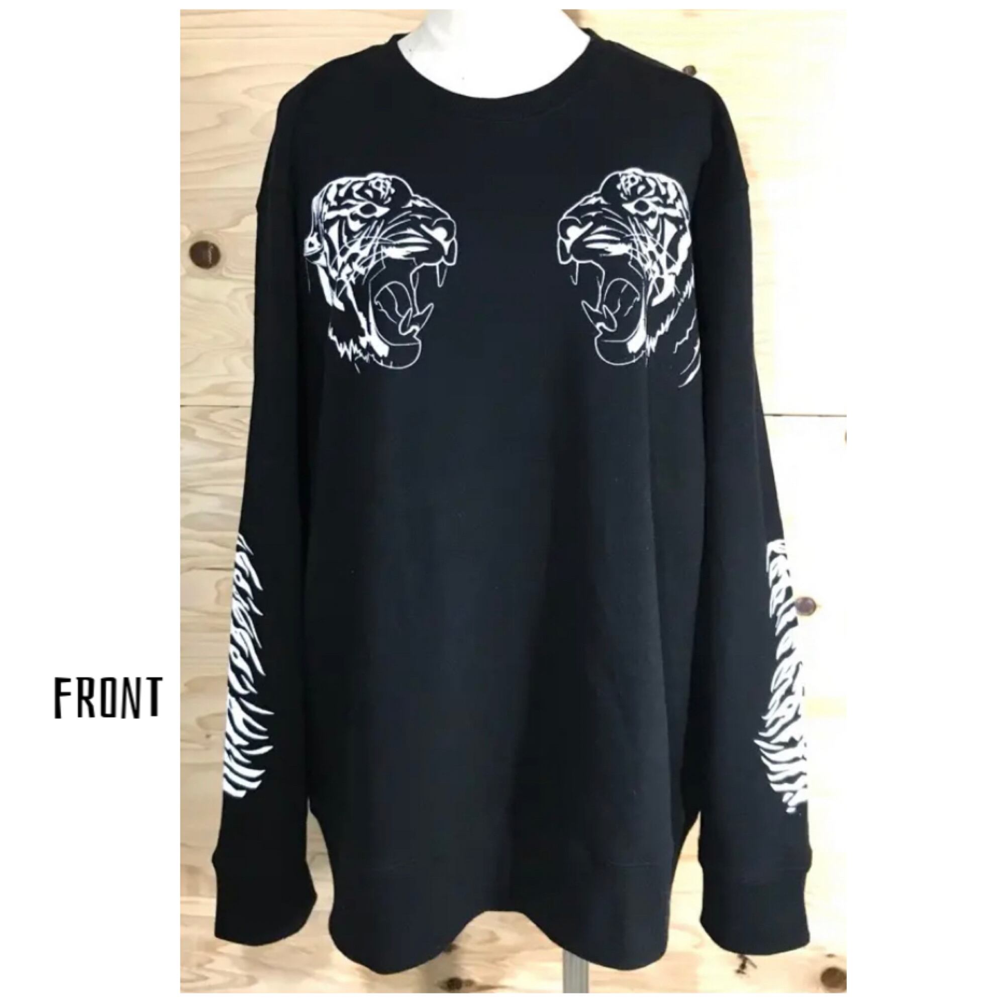虎 トレーナー タイガー 黒 スエット 袖プリント サブカル ロック 地雷 闇 かわいい カッコいい トップス ユニセックス 原宿 韓国ファッション pasha-pasha88 パシャパシャハチハチ