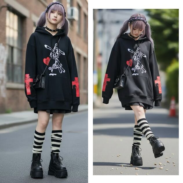 黒パーカー 黒 ブラック プルオーバーパーカー ウサギ クロス ハート 地雷 病みかわいい サブカル メンヘラ 病み 闇 やみかわ やみかわいい 原宿 袖プリント オリジナル