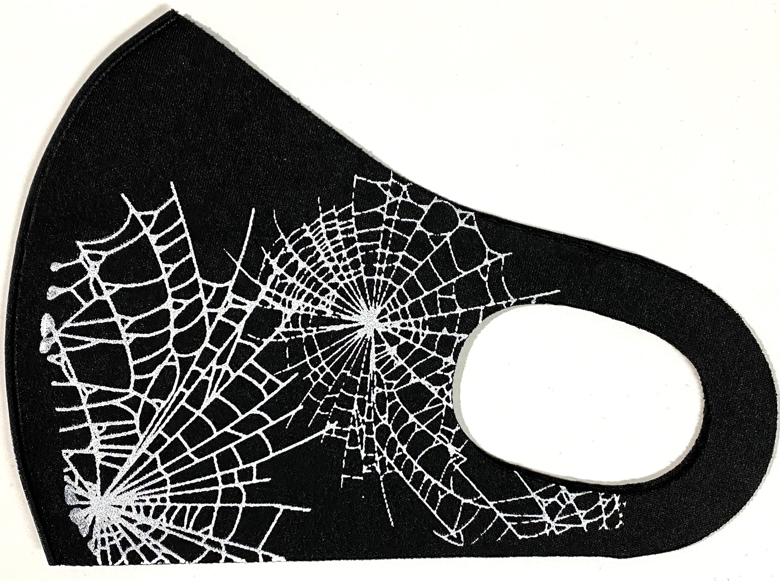 片面に蜘蛛の巣のイラストがインパクト大の洗えるオリジナル黒マスクです。