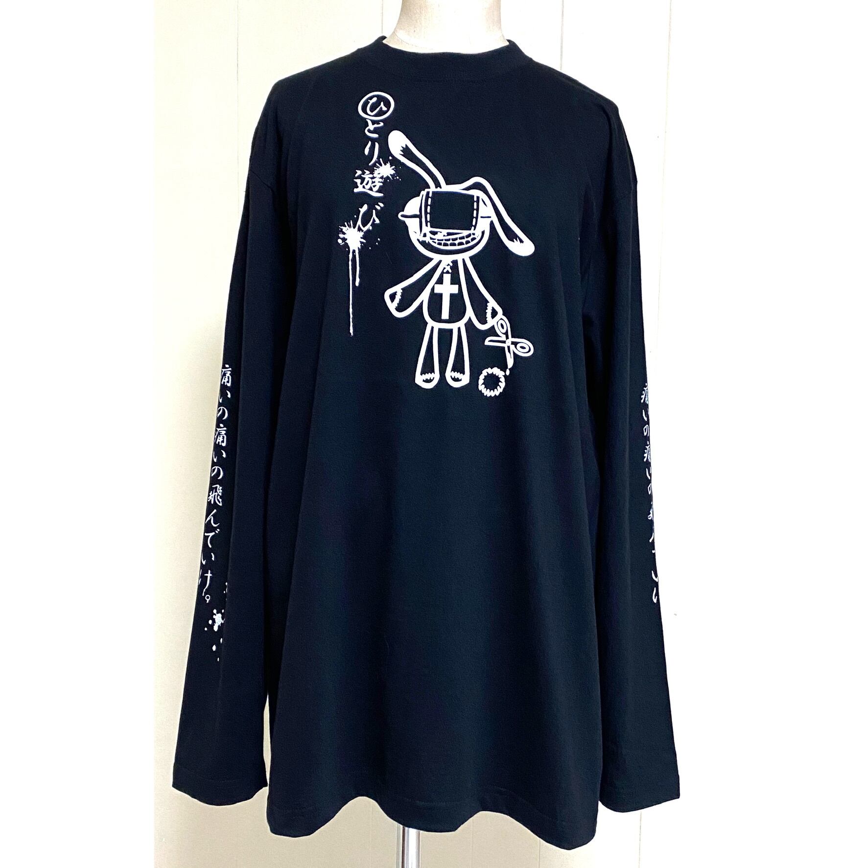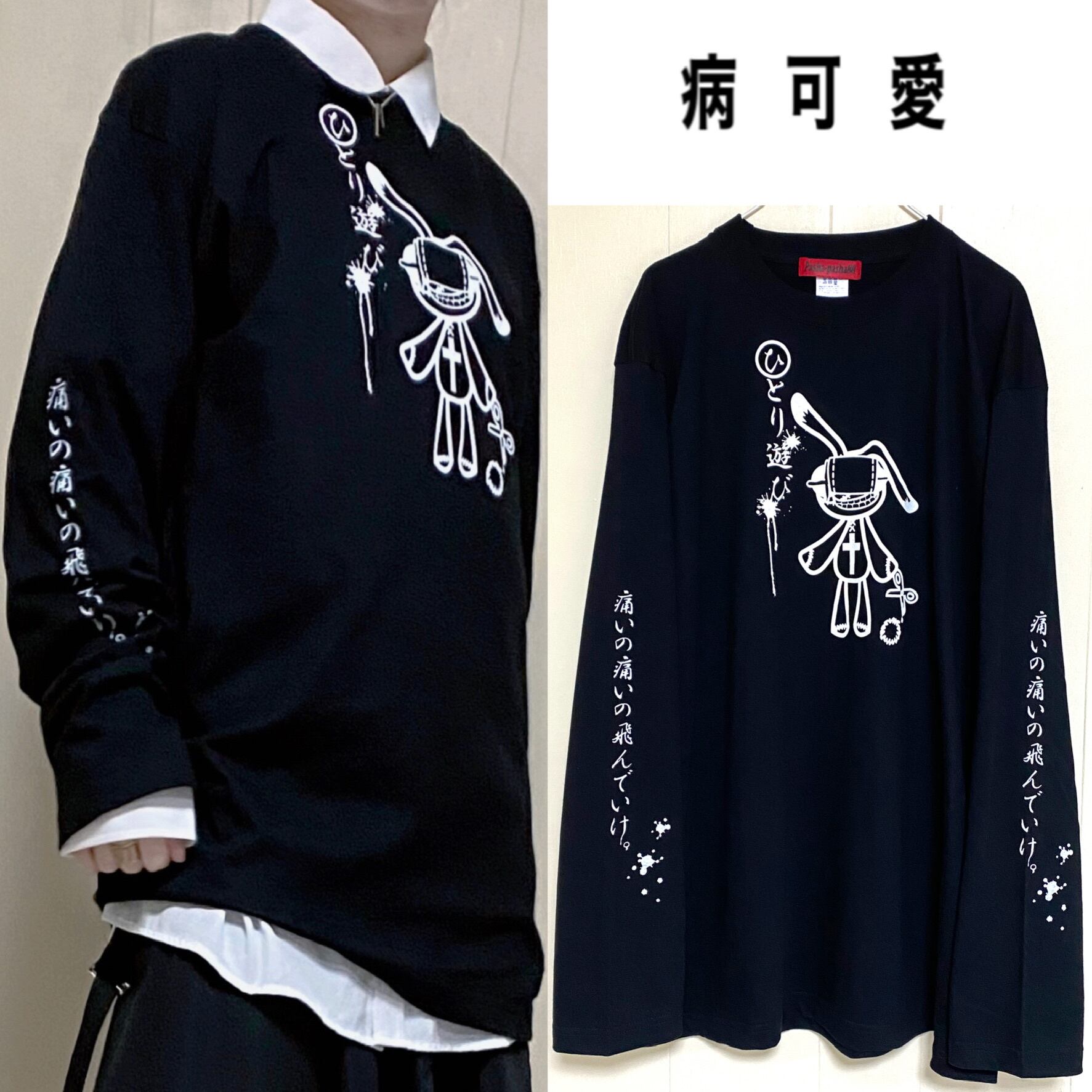 病みかわいい 地雷 地雷系 ロング Tシャツ ロンT 黒 ブラック サブカル地雷 マスク うさぎ ロゴ 文字 原宿 原宿系 プリント イラスト 大きめ オリジナル 個性的 個性派 袖プリント かっこかわいい メンヘラ サブカル ファッション pasha-pasha88 パシャパシャハチハチ