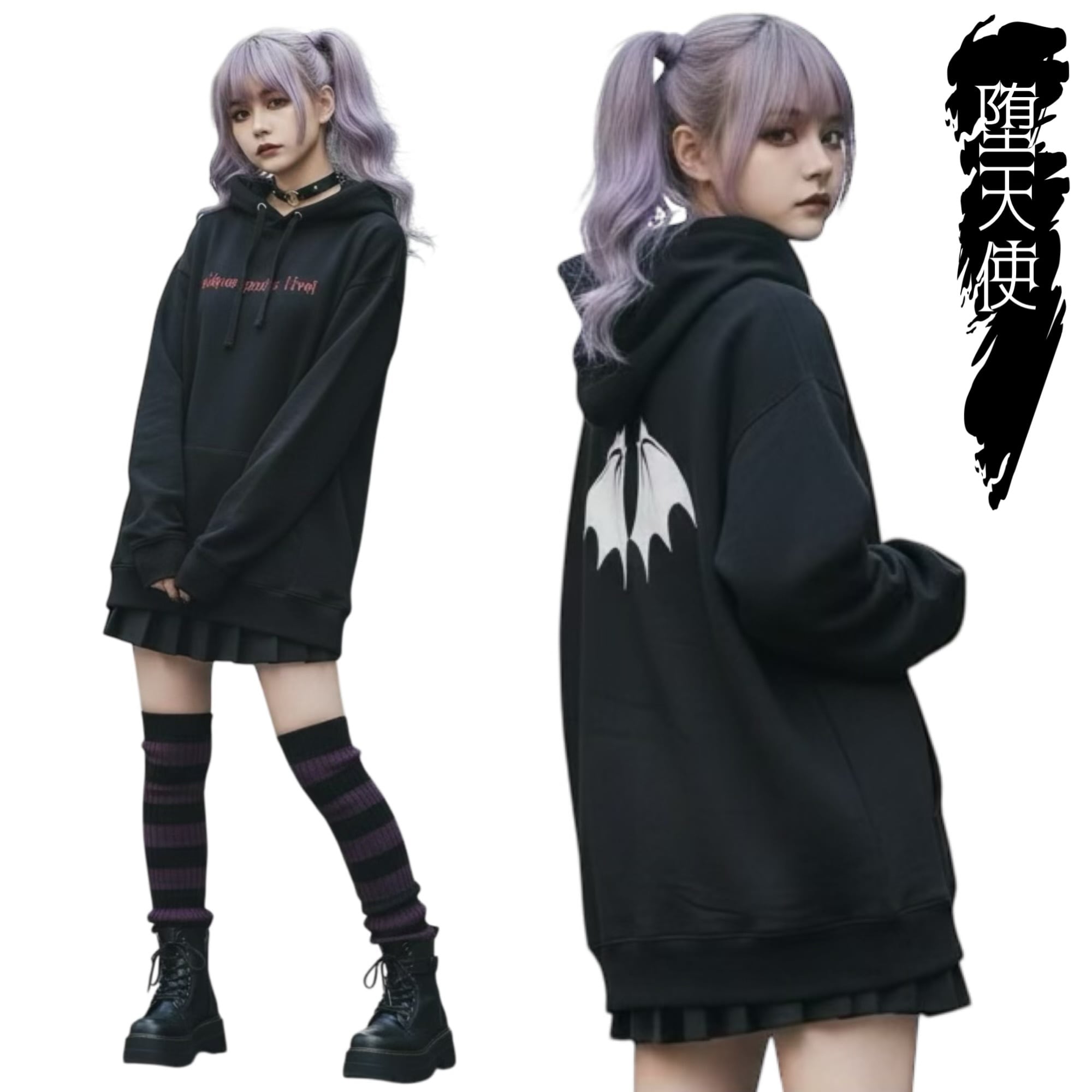 サブカル パーカー 病みかわいい 羽 悪魔 白プリント オリジナル 地雷 サブカル地雷 イラスト メンヘラ 闇系 病み系 原宿ファッション 韓国ファッション pasha-pasha88 パシャパシャハチハチ
