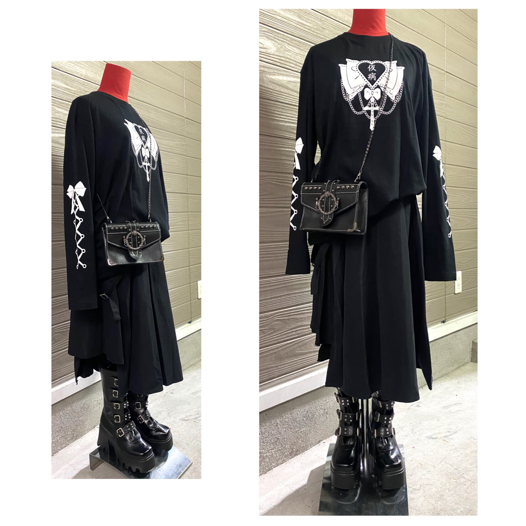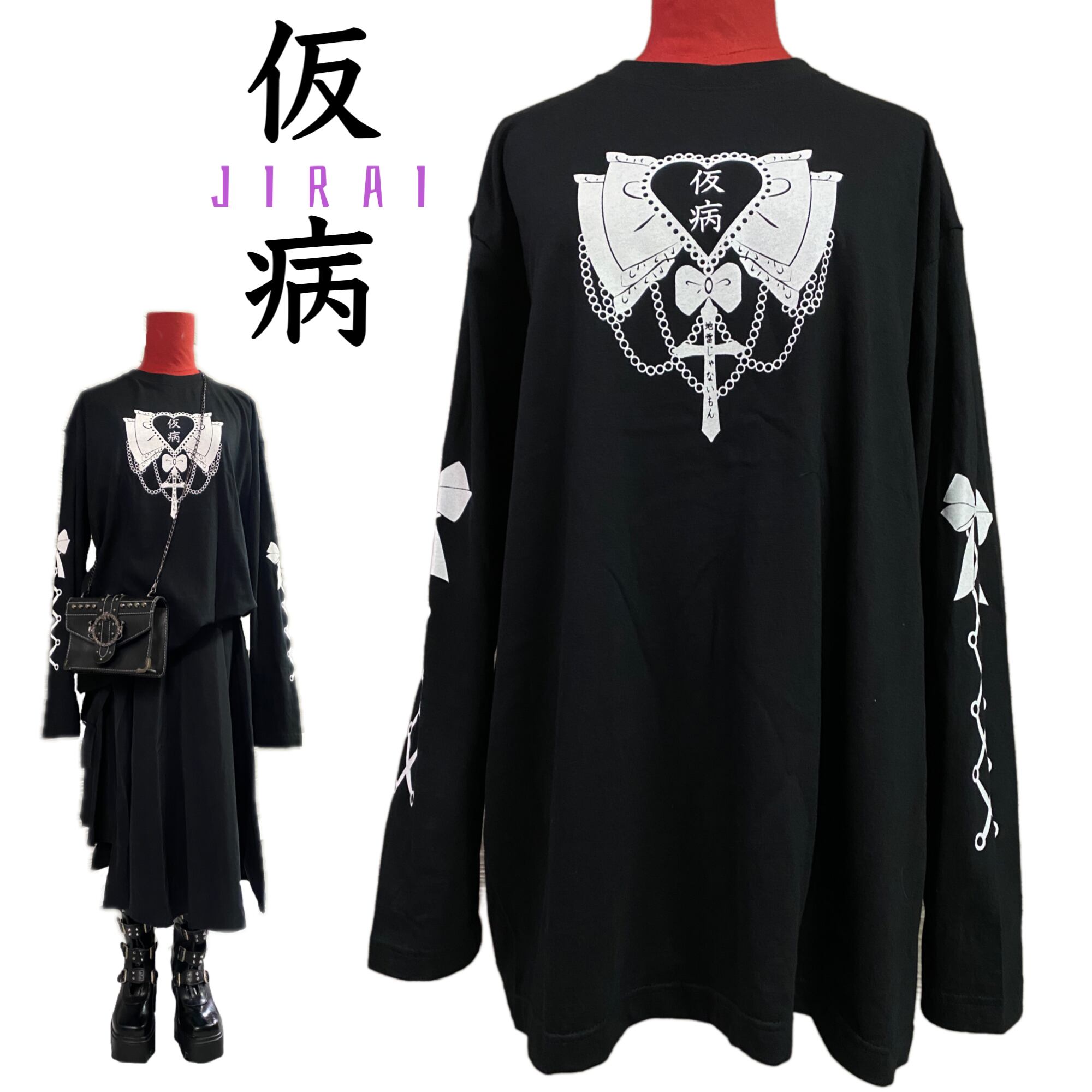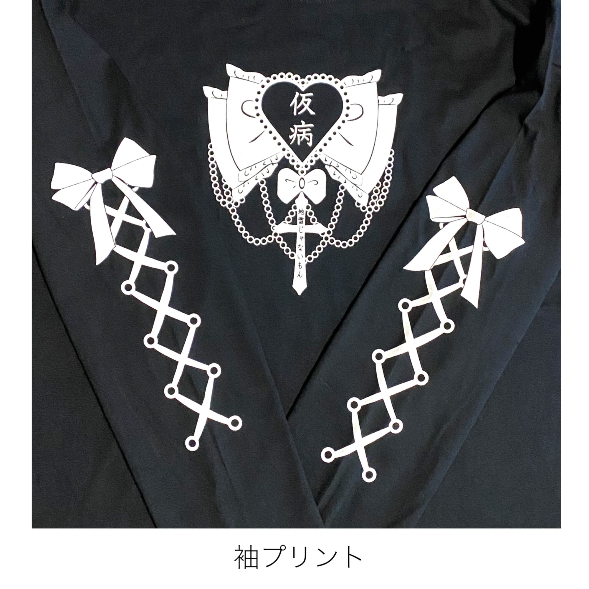#ロングTシャツ #黒 #ブラック #イラスト #プリント #サブカル#地雷#闇かわ#病みかわいい#原宿#harajuku#リボン#袖プリント#オリジナル#ダンス #個性的 #pasha-pasha88/パシャパシャ