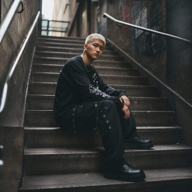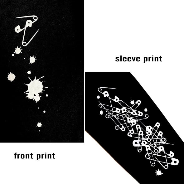 袖のハードでロックな安全ピンのプリントとフロントの闇感がかっこいいイラストロングTシャツ