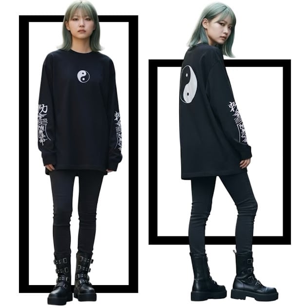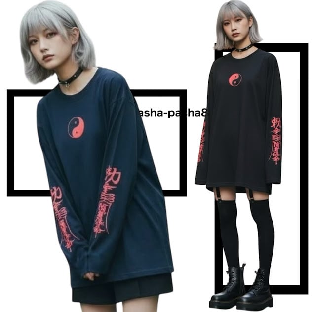 #チャイナ #病みかわいい#病みかわ #地雷 #ロングTシャツ #ロンT #長T #陰陽マーク #勾玉 #中華 #大きいサイズ #大きめ #袖プリント #トップス#原宿 #原宿系 #レディース #メンズ #ユニセックス #サブカル #個性派 #個性的 #おしゃれ #双子コーデ #お揃い #お札 #pasha-pasha88#パシャパシャハチハチ