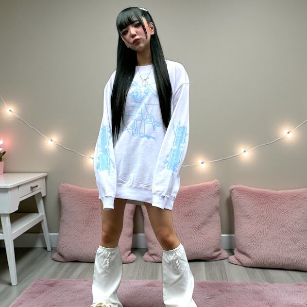天使界隈 水色界隈 トレーナー スウェット トップス ホワイト 白 服 サブカル 闇 うさぎ 袖プリント 韓国ファッション 地雷 かわいい 水色 原宿 大きめ オーバーサイズ pasha-pasha88 パシャパシャハチハチ