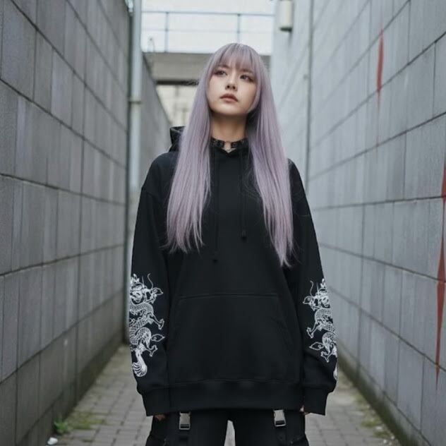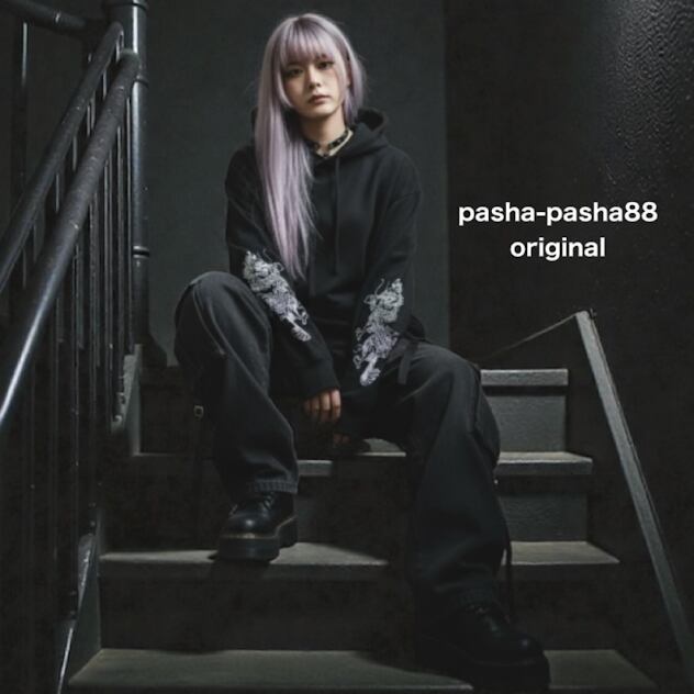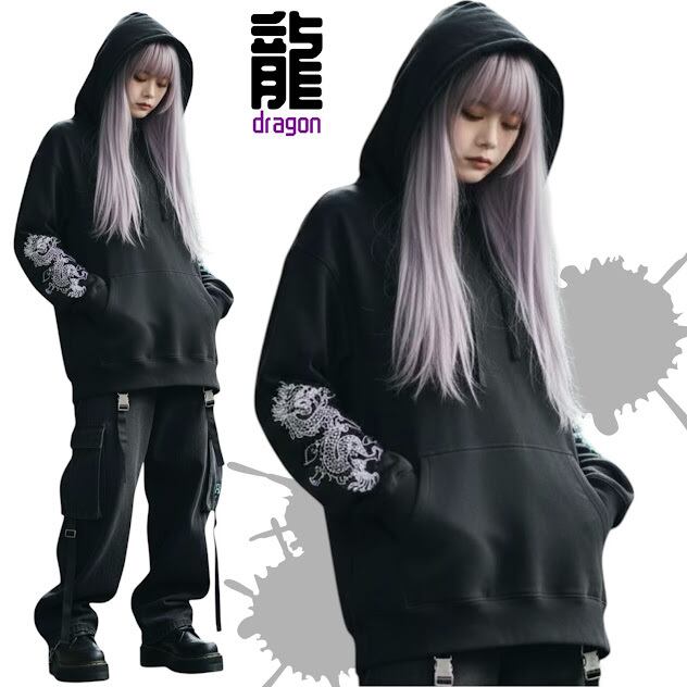 パーカー チャイナ 龍 中華 ドラゴン 黒パーカー プルオーバーパーカー ブラック 袖プリント 大きいサイズ 大きめ ビッグシルエット 地雷 地雷系 ブラック 黒 病み可愛いサブカル ロック バンギャ 個性的 個性派 pasha-pasha88/ パシャパシャハチハチ/